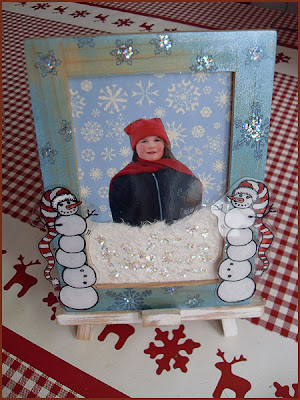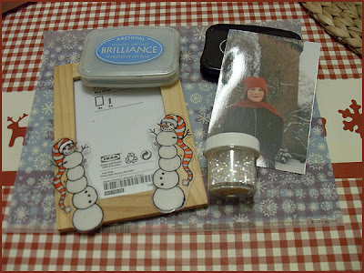 Das Foto habe ich ausgeschnitten und auf das Vellum geklebt. In den Rahmen eingepasst. Den Rahmen habe ich vorher mit dem blauen Brilliance eingeschmiert. Die Farbe muss gut trocknen, dann kann man sie mit wasserfester Tusche bestempeln. Vor das Foto kam eine Lage aus grob gerissenem Naturpaier, um einen Schneeeffekt zu erzeugen. Die Schneeflockenmotive auf dem Rahmen und das Naturpapier bekamen kleine Tupfer mit Klebstoff (uhu) und darauf Glitzer. Trocknen lassen. Die beiden Schneemänner habe ich ebenfalls mit Klebstoff auf den Rahmen gepappt. Feddich.