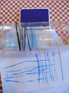 Das sind Haushaltsgummis um eine leere Flasche gewickelt, mit Stempelfarbe eingefärbt und abgedruckt. Mehr will ich nicht zeigen, das blockiert nur eure Phantasie.