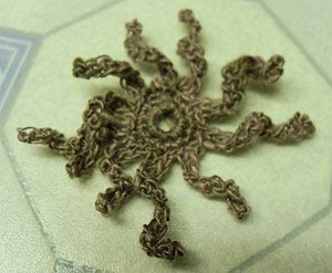 Als Abschluß ein wirres Experiment. Ring aus 4 Luftmaschen mit festen Maschen umhäkeln, in die erste Masche eine Luftmaschenkette häkeln (ca 20 LM) und diese dann mit je 1 festen Masche behäkeln, zwei Maschen der mittleren Ringes behäkeln, und wieder eine Luftmaschenkette anschlagen und behäkeln. Dabei die Länge der Luftmaschenketten variieren. Einmal rundum und fertig ist die Mini-Chrysamtheme.