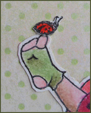 Die letzte Karte die ich euch zeigte hatte diesen supersüßen PB-Stempel, erinnert ihr euch? Den Marikä im Körbchen. Den habe ich aus dem Körbchen entfernt und der Elfe auf den Zeh gesetzt. Irgendwie passt er dort perfekt hin.