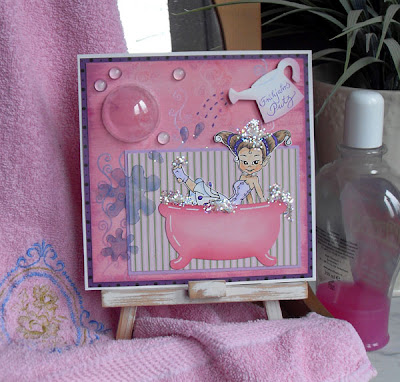 Ausgangspunkt meiner Umsetzung des tollen Sketches von Flati war die große Blume des Sketches. Ich habe keine großen Blumen. Aber allen möglichen anderen Kram. Zum Beispiel Plastikformen. Sieht die nicht aus wie eine große Seifenblase? Ausgehend von der Seifenblase fiel mir die Badewannen-Stanzform ein. Ich finde sehr lustig, was man mit der sitzenden Elfe alles anstellen kann: Jetzt sitzt sie in einer Wanne. Jede Menge Glitzer ist der Schaum und frisches Wasser kommt aus einer Gießkanne (Handstanze). Irgendwo musste ich ja einen „Text“ herbekommen….