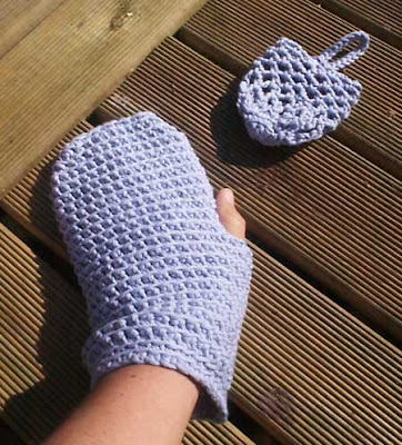Da ich auch immer gern einen Einsatzzweck für eine Karte im Hinterkopf habe, fiel mir ein, dass Häkler ja als Gastgeschenke gern „Spa Sets“ verschenken. Einen gehäkelten Waschhandschuh mit Seifensäkchen zum Beispiel: