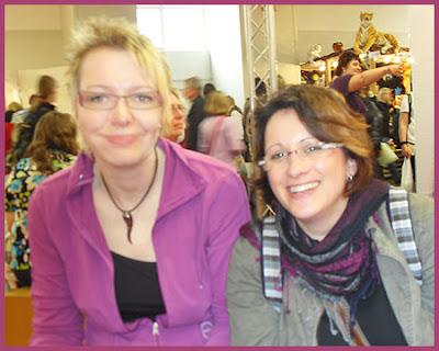 Am Stand von Anne gab es weitere tolle Zusammentreffen: Aud und Anja, Tanja und immer wieder meine Anne, und ein allererstes Zusammentreffen mit FLATI!!! Auf die Gefahr hin mich für immer und ewig bei ihr unbeliebt zu machen, hier ein Schnappschuß von Sonja (Flati, rechts) und ihrer Freundin Maren (Ivi) (für ihre blogs klickt auf ihre Namen) beim Würstchenessen. Leider hat meine Kamera mich auf der Creativa ständig veräppelt (ich bin zu doof die zu bedienen), mal blitzt es Stunden zu spät, mal gar nicht. Aber man erkennt vage zwei Personen und die Würstchen: