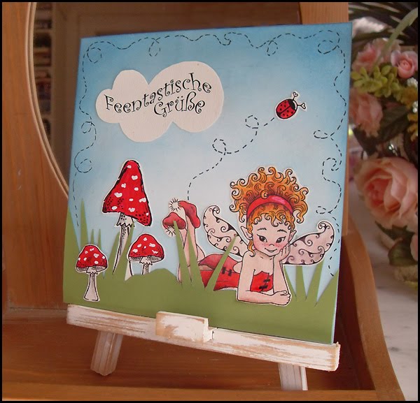 Die Karte ist ganz bewusst einfach gehalten. Das Gras nicht gewischt, nichts gemattet, kein Schnickschnack. Klare, leuchtende Farben. Und ich habe endlich Pilze, jaaaaa. Und einen Käfer. Käfer hat glaube ich jede Stempelfirma irgendwie, aber ich brauch ja einen eigenen.