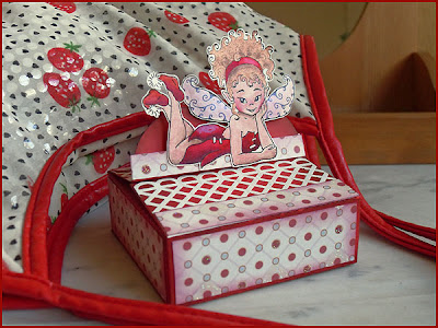 Im rot-grünen Farbenrausch habe ich schnell noch eine weitere Kleinigkeit gebastelt, eine Schachtel. Aus Stempelladenzeiten besitze ich noch eine Stanze, die Schachteln und Kartenformen ausstanzt (nein, die Erdbeere ist freihand geschnitten). Eine der Formen ergibt eine kleine rechteckige Schachtel, die man oben mit zwei halbrunden Laschen verschließen kann. Über diese Laschen habe ich einen Pappkragen geschoben und an diesem die Elfe befestigt.