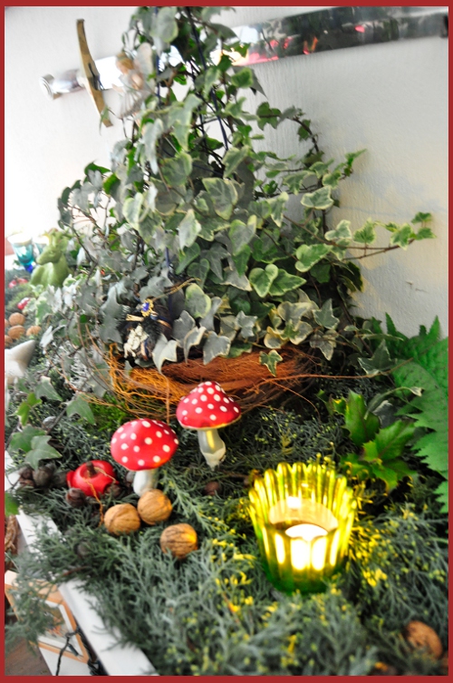 Ganz oben wacht die Weihnachtselfe, eine der „Flower Fairies“ der genialen Zeichnerin Cicely Mary Barker. Die Elfe hat schon viele Umzüge mitgemacht und bereits zwei Sommer im Garten überstanden. Ich liebe sie. Leider sind alle Fotos total verwackelt, sehr unprofessionell. Tut mir leid. Na, wer findet die Elfe?
