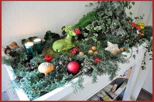 Das Tablett hat die gleiche Größe wie der „Kamin“ und bekam eine umlaufende Holzkante, damit nix runterfallen kann. Praktisch, was? Also bekam mein Kamin statt eines schnöden Aufleger eine flächendeckende Verschönerung. Weil ich nun mal das Elfenthema so mag, wurde meine diesjährige Adventdekoration ein halber Märchenwald.