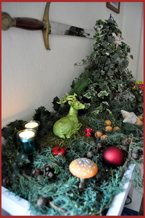 Jaja, ich weiß- es gab schon elegantere Adventsdekorationen. Aber ich mag Geschichten, und eine Dekoration soll mir eine Geschichte erzählen. Mein Kamin berichtet von magischen Wesen und verzauberten Orten. Auf einem halben Quadratmeter. Besser als nix.