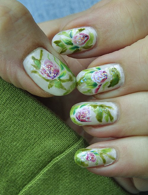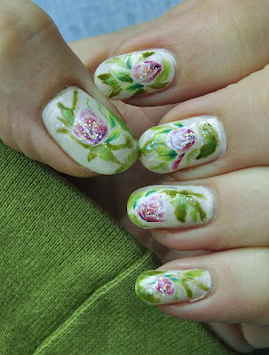 Da ich mit Nagel-Tattoos so gute Erfahrungen gemacht habe, habe ich mir heute hübsche Blumen für die Nägel ausgesucht. Als Grundierung hatte ich einen weißen Lack von Essence ausgewählt, der aber leider so dünn war, dass ich ganze drei (!) Lagen auftragen musste, die dann auch noch sehr unregelmäßig blieben. Darauf kam ein Jolfin Tattoo mit Rosen. Einen preiswerten Bastelpinsel habe ich so zurechtgestutzt, dass ich mit diversen grünen Lacken kleine Blätter als Ergänzung der Sticker aufgemalt habe.