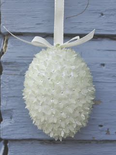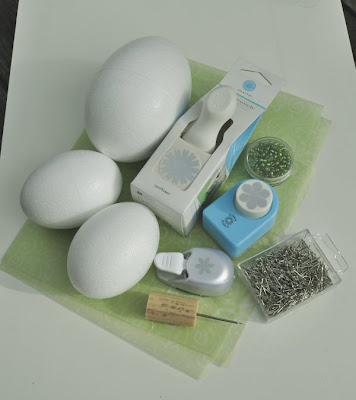What you need to make this pretty embellished egg is shown in the second picture: At least one punch (I used the small one), pretty paper (I used vellum), pins and a styrofoam form.
