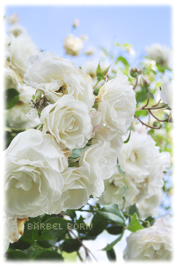 Kürzlich stand ich wieder vor meinem geliebten Strauch mit der „Schneewittchen“-Rose, welcher in der Zeit unseres Aufenthalts hier in den Himmel zu wachsen scheint. Schon seit ein paar Jahren kann ich mir die zauberhaften, bei Sonnenwetter weithin duftenden Blüten von unten anschauen, da sie hoch über meinem Kopf wachsen.
