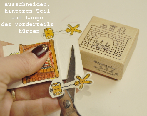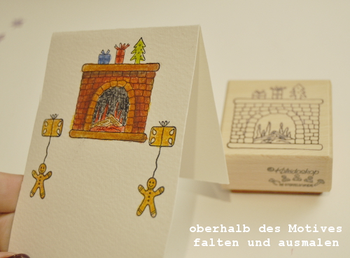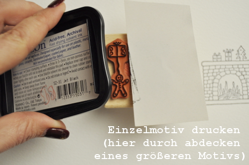 Wenn man keinen kleinen Stempel hat, kann man auch einen größeren mit Einzelmotiven nehmen und die unerwünschten vor dem Einfärben abdecken (ja, der deutsche Text ist wieder mal viel länger)