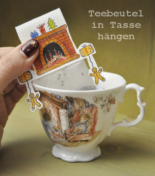 Doof. Ich dachte daran, den Teebeutel mit einer kleinen Papier“tasche“ oben an einem Teelöffel zu befestigen. Doof. Quer über die Tasse legen. Doof. All die schönen Kopfgeburten führten zu nix. Bis ich mich- nach wie vor ratlos- an den Basteltisch gesetzt habe. Das sollte man öfter tun: Ratlos einfach drauflos machen. Ok, das mache ich meistens, aber heute war es berauschend. Denn wider Erwarten habe ich einen Teebeutelhalter entworfen. Ich finde man könnte ihn noch verbessern, aber als Prototyp gefällt er mir schon ganz gut. Und netterweise gab meine Porzellansammlung sogar eine passende Tasse (mit Kamin!) von Brambly Hedge her, den bezaubernden Mäusen vom Brombeerhag. Doch bevor ich euch in den Schlaf rede, hier die Anleitung (ich versuche es wieder mit englisch):