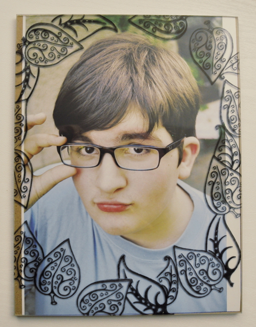 Nun das Foto in den Rahmen legen und mit Stempelmotiven einfassen. Dabei die Maskentechnik verwenden, um Lücken zu schließen (hier gibt es ein Video zur Maskentechnik, wer das nicht kennt: Klick)