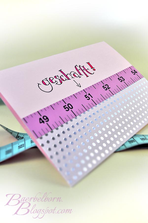 Innerlich ganze 14 habe ich mit den Maßband-Resten rumgespielt, und eine Karte daraus gebastelt. So hätte meine Geburtstagskarte aussehen können, wenn mir jemand eine geschickt hätte. Hat aber keiner. Jep, ich bin ne arme Sau. Aber wer schöne Post bekommen will, der muss auch schöne Post verschicken, und da hapert es doch sehr bei mir.