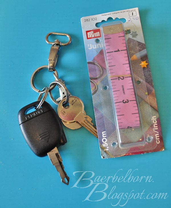 Auf der Liste stand ein neues Schlüsselband. Das gepimpte Band vom letzten Jahr (guckst Du hier) hatte sich in Wohlgefallen aufgelöst. Da ich letzte Woche im Lieblingsstoffladen war, und dort in der Grabbelkiste ein superdupersüßes Maßband lag, hatte ich schon kurz darauf in einem Anfall von „ich hab massig Zeit“ das alte einfach abgeschnitten und lief nun mit einem losen Schlüsselbund herum.