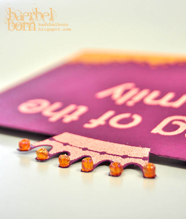 Ich habe die Schablone mit Embossingfarbe schabloniert und Embossingpulver benutzt, welches eigentlich Orange schmelzen sollte. So richtig begeistert bin ich davon allerdings nicht. Die untere Kante habe ich mit Spellbinders „Scalloped Borders One“ gestanzt.