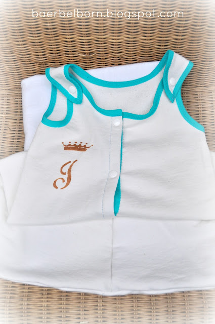 Die Kronen-Schablone und ein „J“ für Jake kamen dann noch auf einen schnell genähten Schlafsack (abgewandelter Strampler-Schnitt aus der aktuellen Ottobre):