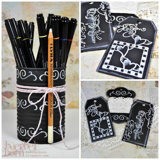 Ich dachte bei der Challenge gleich an einen Stempel von der Stempelschmiede „Zum Schulanfang“, aber obwohl ich mir sicher bin ihn zu besitzen konnte ich ihn nicht finden… doof. Darum halt andere Motive auf den Tags. Die Technik wollte ich schon ewig ausprobieren, denn mit weiß auf schwarz kann man diesen tollen „Schultafel-Look“ erzeugen.