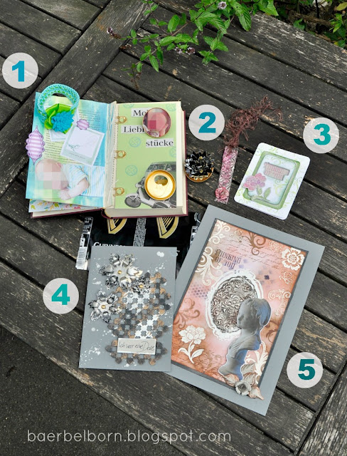 2) links und unter der 2: Deko und kleiner Bilderrahmen aus einem Dosendeckel. Dazu ein andermal mehr, Rechts davon ein Lesezeichen aus geprägten Dosenresten.