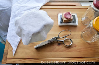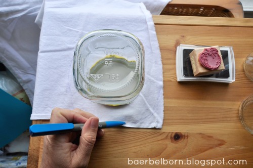 Alles gut trocknen lassen und mit hübschem Band über dem Glas befestigen. Schnell und gut. Und einmalig! Als Geschenk schöner als gekaufter Stoff, finde ich. Und als Utensilien-Behälter macht es auch was her.