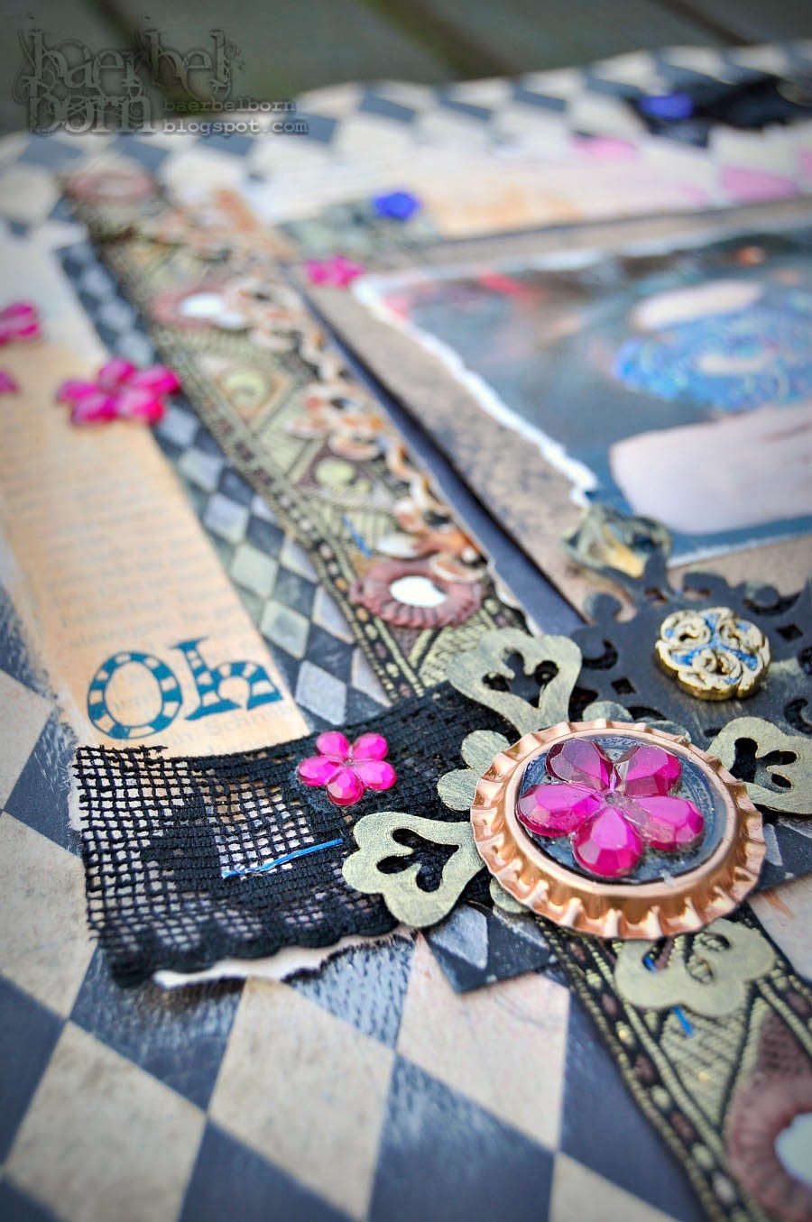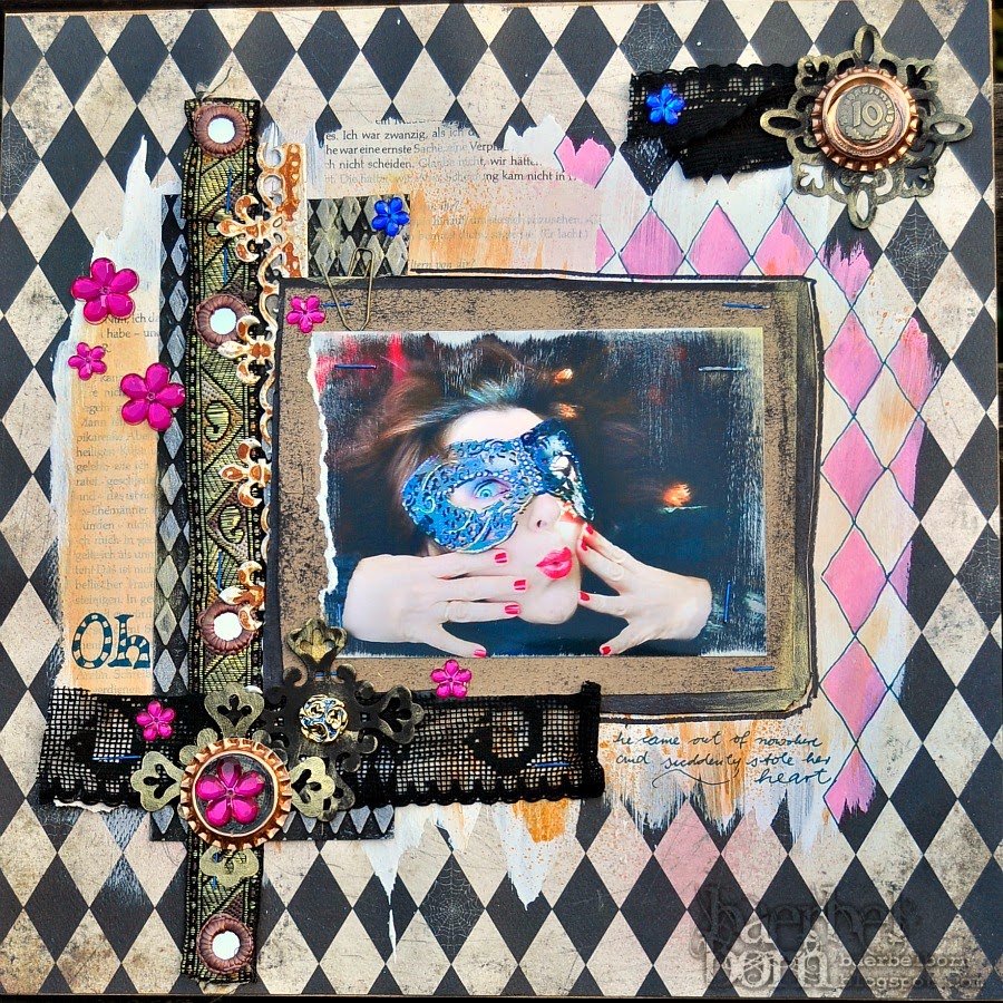 Karan hat außerdem für diese Runde ihrer Sketche das Oberthema „Mixed Media“ gewählt, darum kommen hier mehr und mehr Malfarben zu Einsatz. Ich habe das Hintergrundpapier und die aufgeklebten Buchseiten mit Gesso übermalt. Einige der Rauten wurden danach mit Wasserfarben coloriert.