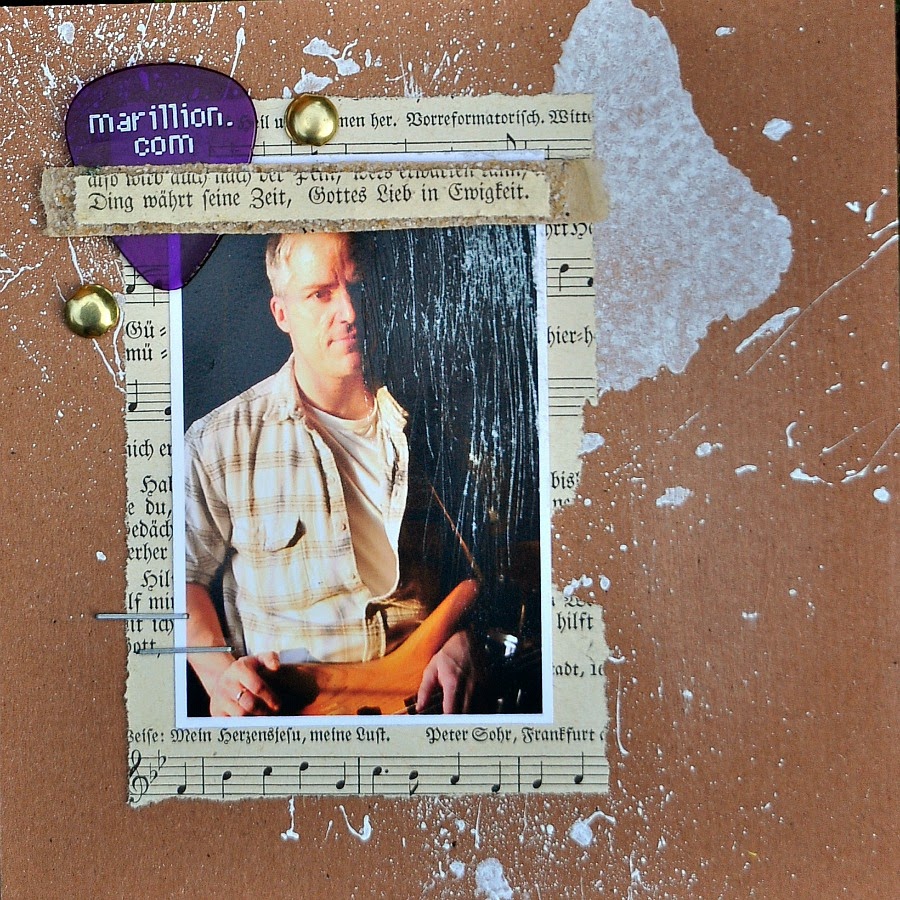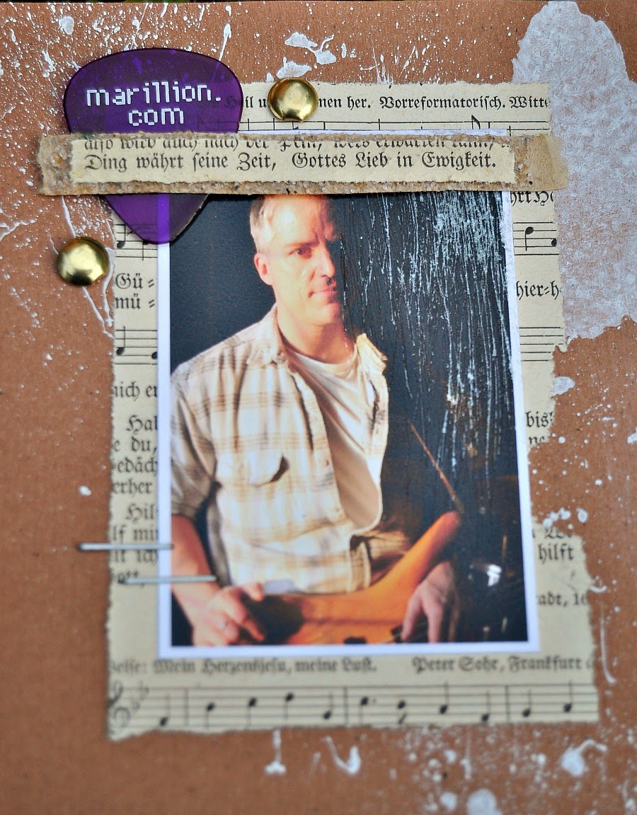 Mein lieber Ehemann (Foto oben) hat früher selbst Musik gemacht, heute lauschen wir gemeinsam den Klängen unserer Lieblingsband Marillion. Das braune Hintergrundpapier ist von Gmund, das Notenblatt aus einem alten Gesangbuch gerissen (Danke Oma). Seht ihr die Tackerklammern? Niemals nicht hätte ich früher Fotos auf schöne Seiten getackert… aber seit ich dieses Detail bei Karans Sketchen entdeckt habe, kann ich damit garnicht mehr aufhören.